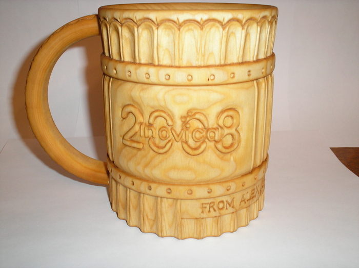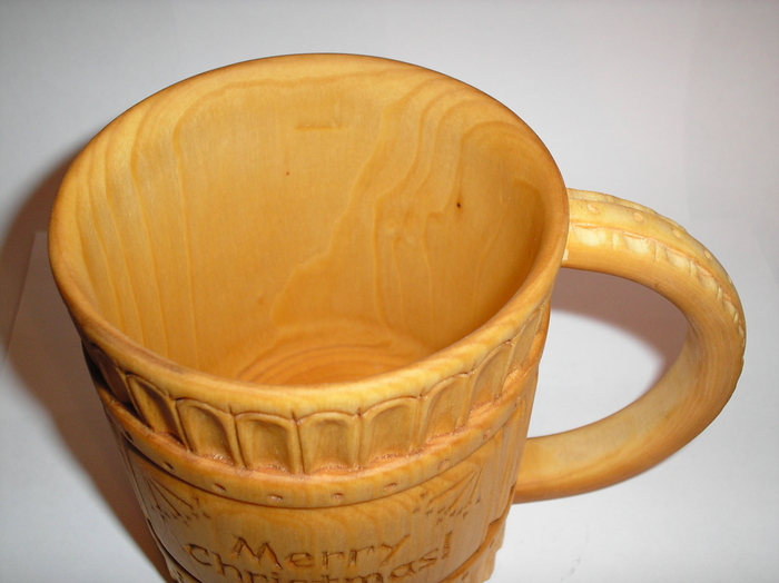 Липа, выточена на токарном станке, ёмкостью 1 литр, ручка изготовлена отдельно и приклеена.