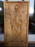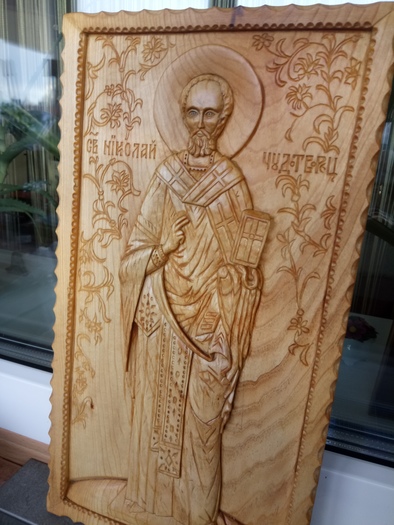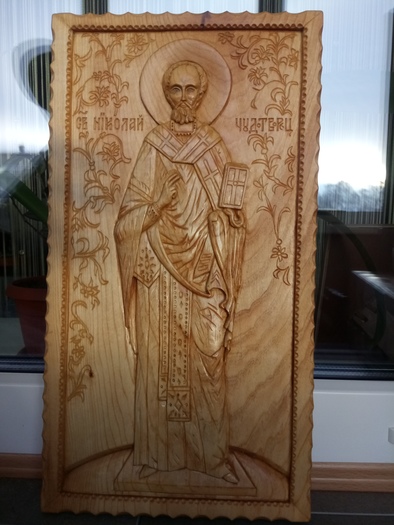 Давно мечтал вырезать ростовую икону Св. Николая Чудотворца. Впервые увидел скульптуру Николая Чудотворца в п. Солодча под Рязанью. Это единственная сохранившаяся копия скульптуры Николая Чудотворца из Мира-Кеково (Турция) - родины Святителя.